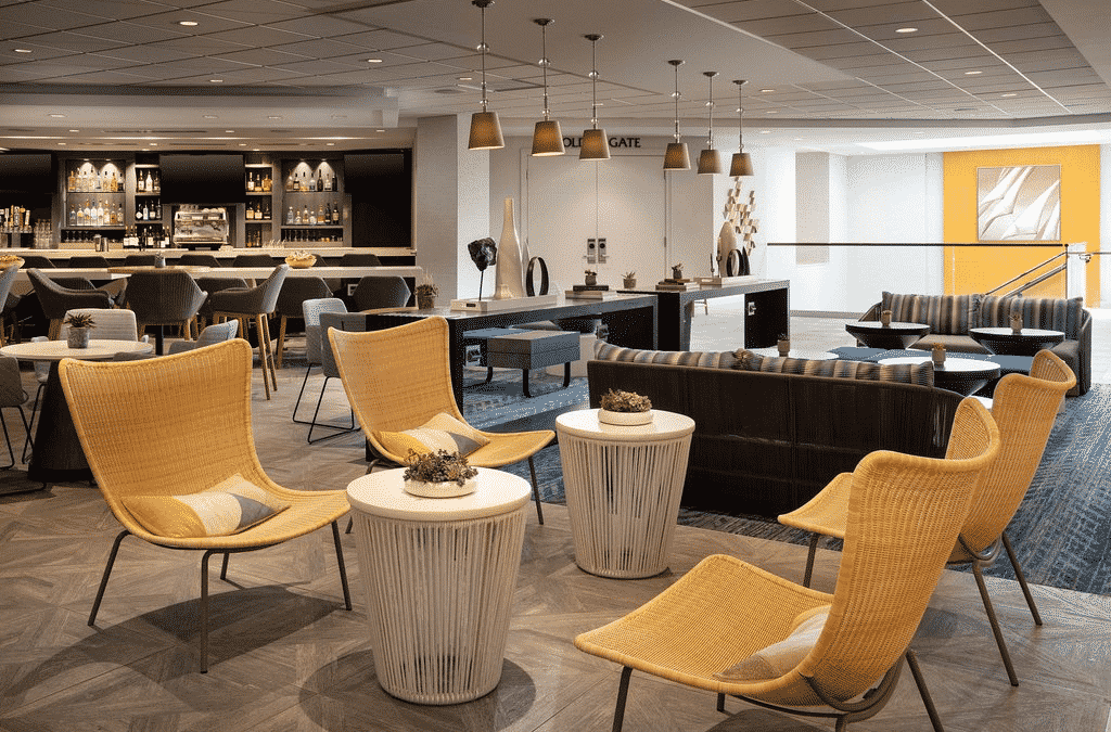 inside hotel lounge with yellow chairs